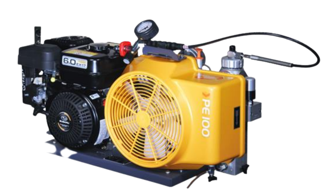 Compresor Mod PE-100 TB de la gama Poseidón motor Gasolina de 4 tiempos, incluye un Latiguillo de 300 bar (4.516 psi).
